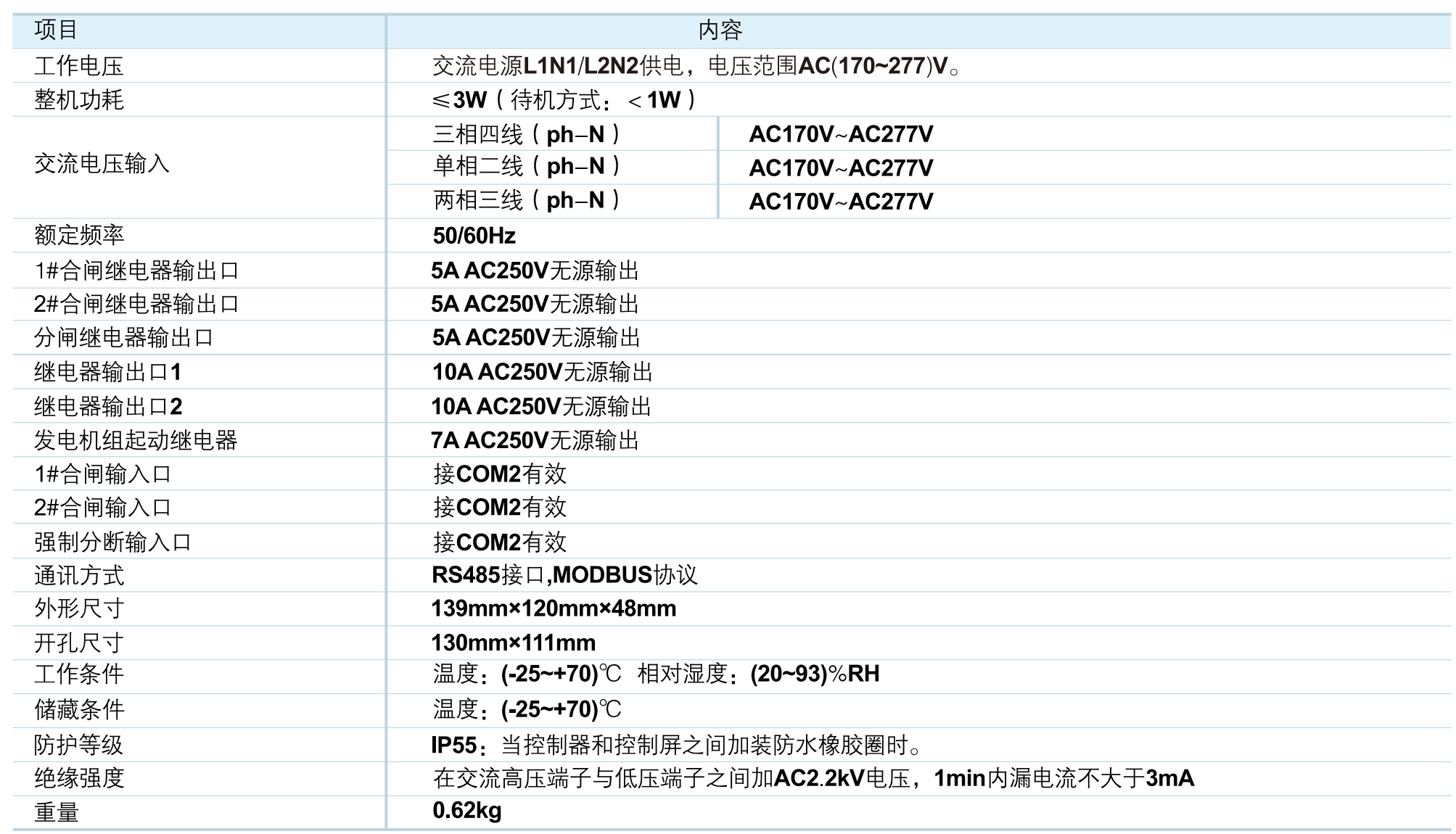 SKR2-A双电源自动转换开关控制器以微处理器为核心构成,可精确地检测两路三相/单相电压,对出现的电压异常(失电、过压、欠压、缺相、过频、欠频)做出准确的判断,经延时后控制ATS切换。适用于一个分断位、无分断位的ATS开关。控制器具有一路电源异常延时后发出起动发电机组信号的功能。通过RS485通讯接口,可实现遥测、遥信、遥控“三遥”功能。与SKT-X消防型ATS组合而成SKT-W型智能ATS,适用于建筑、电力、石油化工及其他行业的自动化配电系统中。