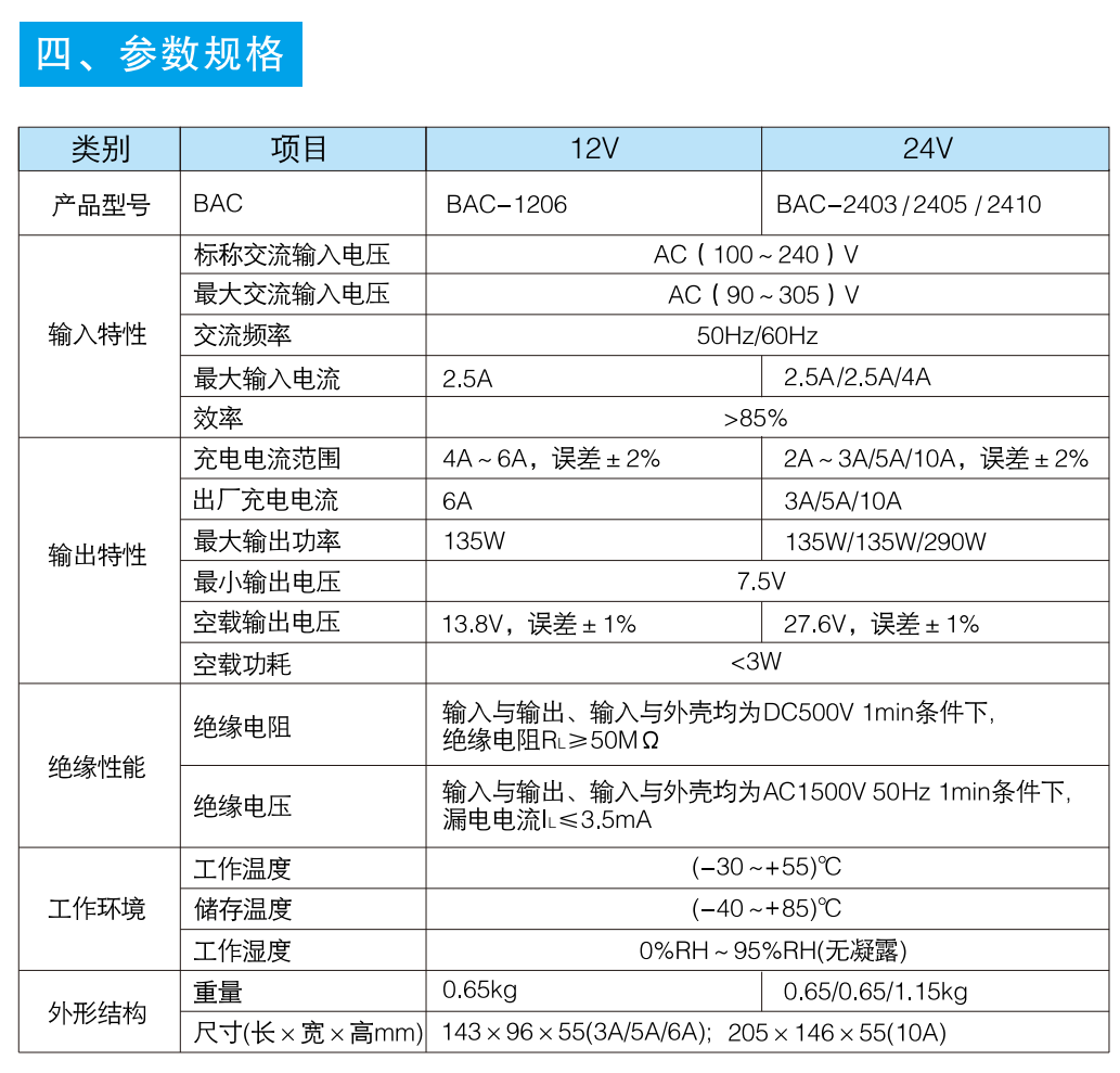 BAC06A系列开关型蓄电池充电器采用新型开关电源器件。