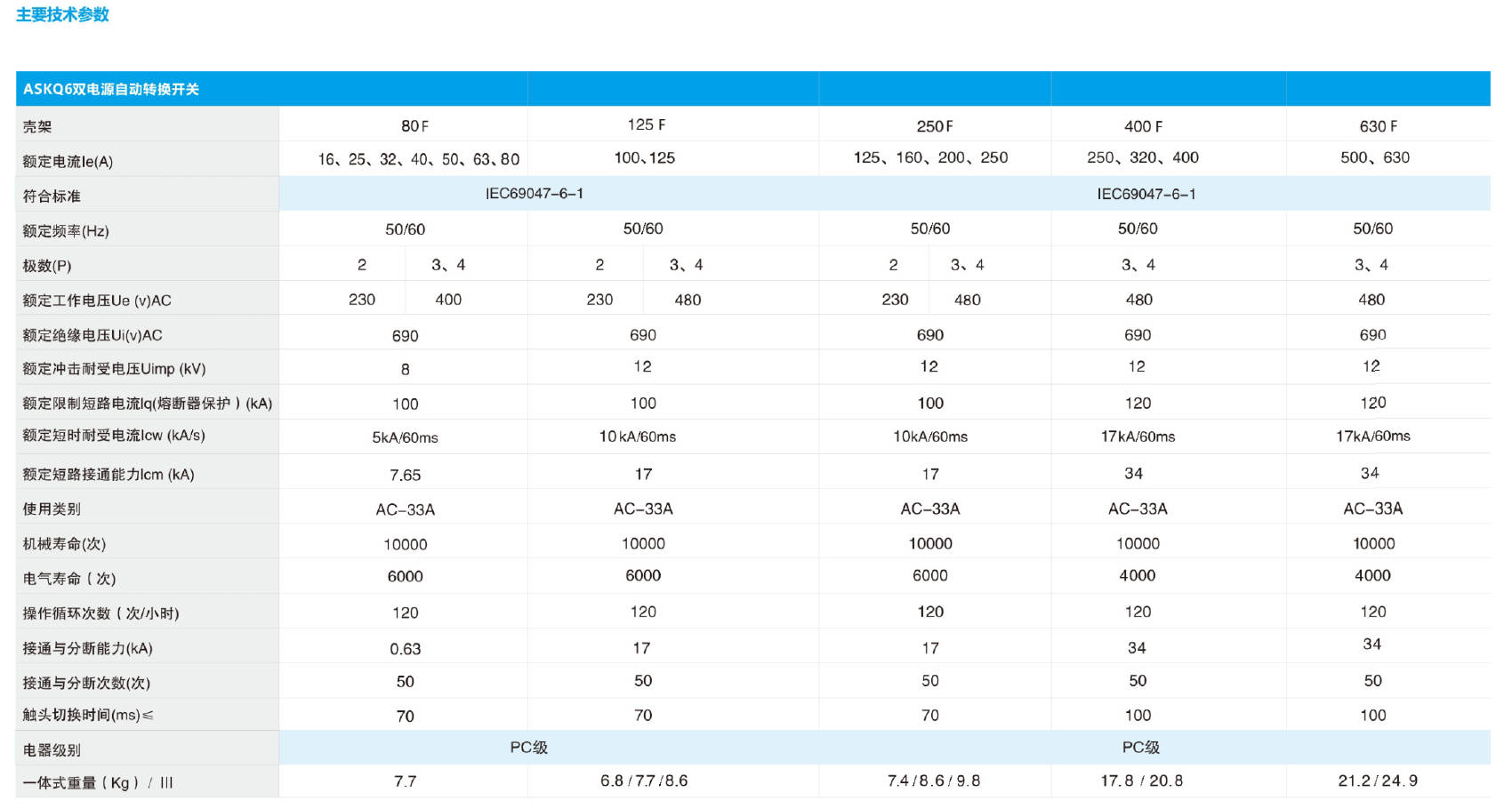 ASKQ6系列双电源自动转换开关,适用于额定工作电压400V及以下,额定频率50Hz,额定电流16~630A的配电系统中。主要用于供电系统在应急情况下的双路电源转换,以确保主要负荷(应急照明、应急楼梯、消防系统等)连续可靠工作。