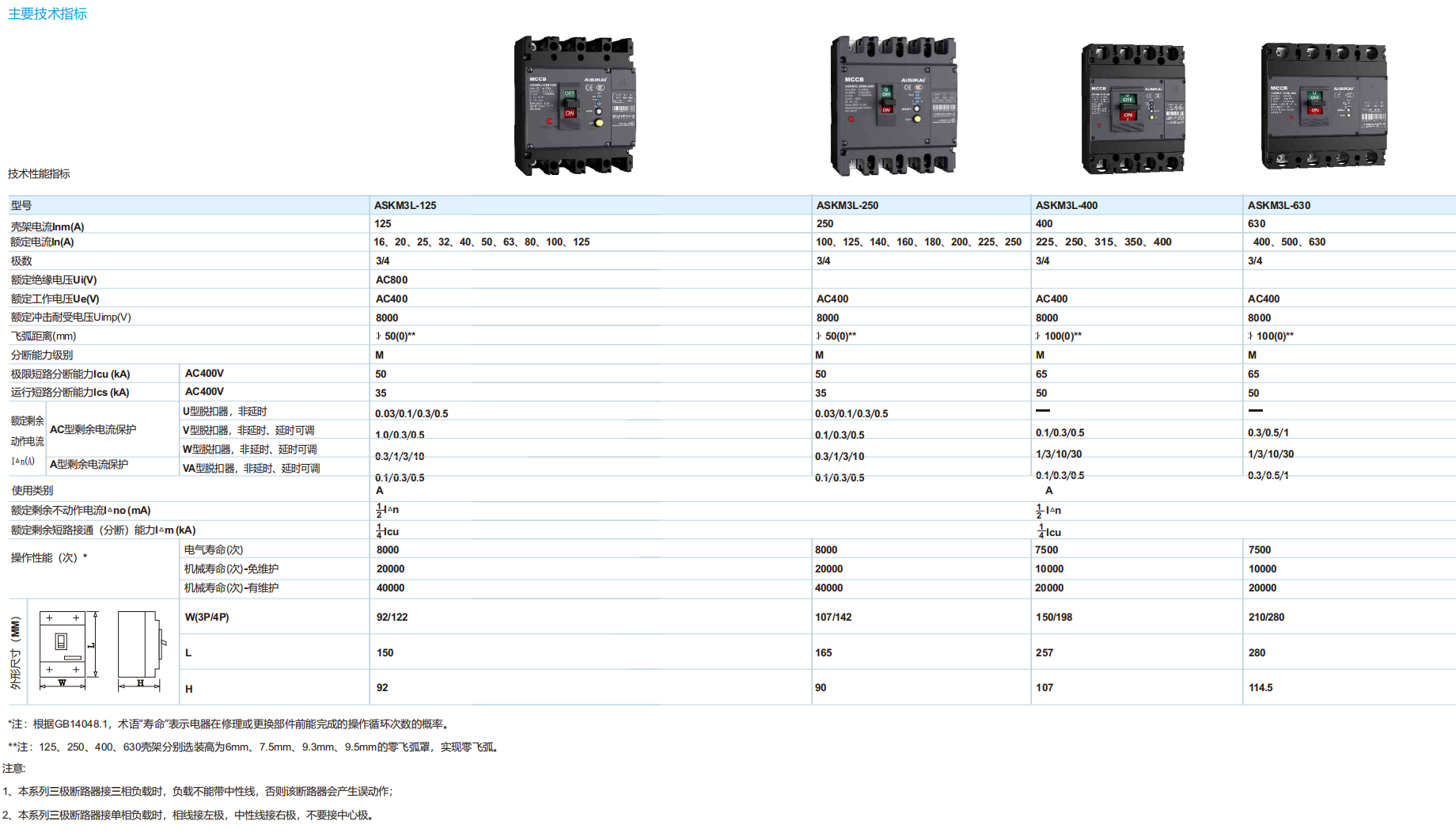 ASKM3L热磁式漏电保护型塑料外壳式断路器(以下简称断路器),是本公司采用国际先进设计、制造技术研制、开发的新型断路器之一。其额定绝缘电压为1000V,适用于交流50Hz,额定工作电压400V及以下,额定工作电流至630A的电路中作不频繁转换及电动机不频繁起动之用。